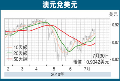 雖然美國首季GDP被向上修訂至成長3.7%,但因為美國第2季GDP初值已下降至只有2.4%的成長幅度,若果美國於本周五公布的7月份就業數據一旦進一步轉壞,則不排除投資者的避險情緒將會有所升溫,該情況亦將對商品貨幣構成一定的下調壓力。此外,在美國經濟有逐漸轉弱傾向的影響下,澳洲央行可能不會急於在本周二有升息行動出現,這亦略為不利於澳元的短期表現。受到日圓持續轉強之下,澳元兌日圓交叉盤可能會遇到頗大的回吐壓力,故此預料澳元兌美元將反覆走低至89.30美仙水平。