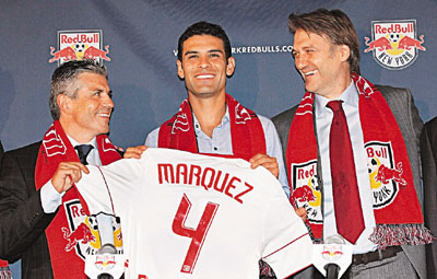 ■墨西哥後衛馬基斯(中)將穿起紐約紅牛隊4號球衣,他強調今次赴美並非等退休,而是要繼續爭取錦標。 路透社