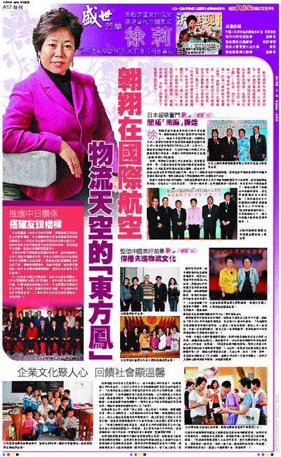航空物流作為現代物流業中的重要系統,以其安全、快捷的獨特優勢倍受重視。這一領域向來是男性主導的領域,但翱翔在國際航空物流天空的「東方鳳」—徐莉,卻打破了這一領域男性獨尊的格局。作為「南海航空貨運(香港)有限公司」的董事長,徐莉不僅被日本總部賦予「東方鳳」的美譽,而且被國際航空物流業讚譽為「龍之女」。徐莉說:「倘若沒有祖國的經濟騰飛,倘若沒有祖國給我廣闊的天空,一個人本事再大,也難有所作為。」徐莉堅毅的奮鬥歷程、真摯的愛國情愫、對社會的積極奉獻,也給人們帶來了豐富有益的啟示。