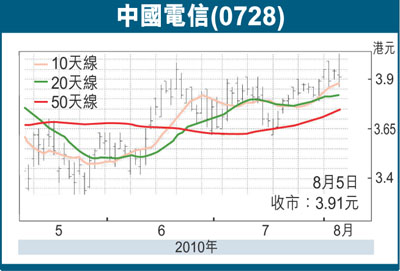 中國電信持續自其兩間競爭對手中搶佔內地流動通訊市場的佔有率。於2010年度上半年,其用戶淨增加1,840萬戶,市場佔有率為30.9%,而按用戶人數計算的流動通訊市場佔有率則由2009年度底的7.7%躍升至2010年度上半年末的9.5%。我們預料該公司將可超越本年度3,000萬戶移動通訊用戶淨增加的目標,並達至3,640萬戶。