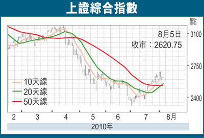 滬指昨日以2,636點低開2點,權重股(金融和地產)的低迷令滬指全日幾乎在「綠盤」中運行,雖早市和午後大盤各有一次摸高「飄紅」的瞬間,但均在2640點遇阻,臨近尾盤時,地產板塊的跳水,一度將股指最低拖至2,606點,終盤滬指上翹收報2,620.76點,下跌17.76點,跌幅0.67%。商業連鎖、消費和醫藥等防禦性板塊漲幅領先,板塊最大漲幅2.76%;房地產和金融板塊則跌幅居首,板塊最大跌幅2.22%。滬市上海醫藥、新華百貨、紅陽能源及福日電子等5家個股漲停,無跌停個股;雲南城投、冠城大通及保利地產等個股跌幅排前,個股最大跌幅5.04%。昨日上漲個股475家,下跌個股458家,上漲家數略多於下跌家數,與指數下挫輕微相背,顯示多空分歧的不一。市場成交1,169.6億元,較上日略增17億元。價跌量微增,價量關係繼續背離,市場震盪整理仍將延續。