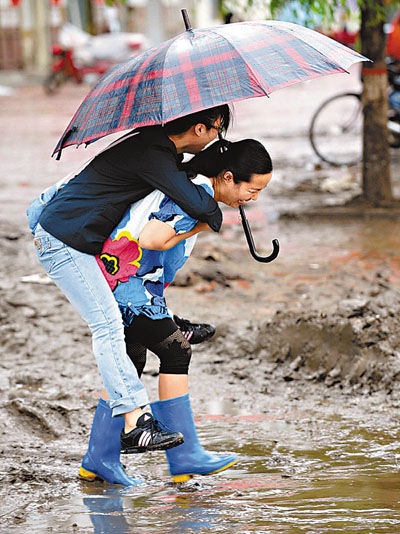 ■吉林永吉縣居民從街頭走過,當地8日晚迎來強降雨。 新華社