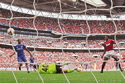 昨晚在溫布萊球場舉行的社區盾,結果由曼聯以3:1勝車路士封王。圖為華倫西亞上半場41分鐘替曼聯破門一刻。路透社
