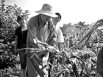 撫摸著被洪水沖倒並絕收的玉米苗,大和尚心痛不已。