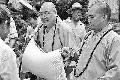 聖輝大和尚親自為受災群眾發放大米和善款 (圖)