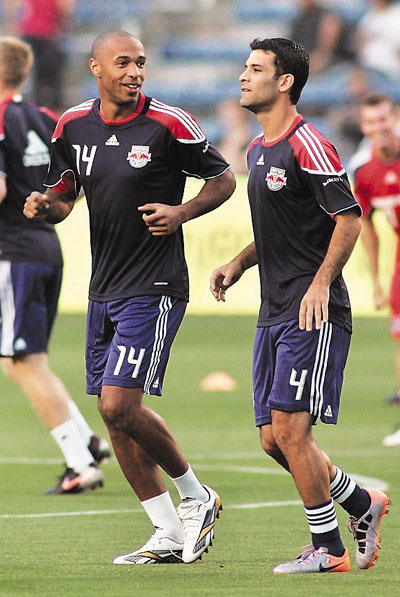 今季先後離開西甲巴塞羅那,在美職聯紐約紅牛重聚的亨利(左)及馬基斯,繼續成為隊友一起訓練。 路透社