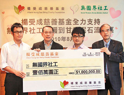 而任「無國界社工」永遠榮譽會長的英皇集團主席楊受成昨日以「楊受成慈善基金」名義捐出100萬港元予無國界社工,並安排該組織之支援團隊親赴災區協助賑災工作。「無國界社工」將派出5名義工於本周五或以前到災區視察災情,並安排該100萬元善款購買災民目前最需要的物資,例如一般生活必需品等。首批物資最快可於本月20日送到災民手中。中聯辦社會工作部副部長黃清芳出席支票交接儀式。