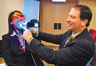 ■美國達傅思大學口腔修復學科副教授Michael A. Schneider(右)表示,利用新儀器可發現未有病徵的口腔癌病人,及早治療。 本報記者嚴敏慧 攝