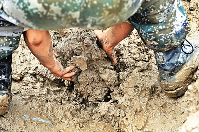 ■解放軍戰士正在泥石流現場進行搜救挖掘工作。 新華社