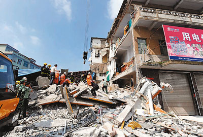 ■13日,廣西貴港市橋圩鎮一棟3層樓房倒塌,救援人員在緊急營救被埋群眾。 新華社