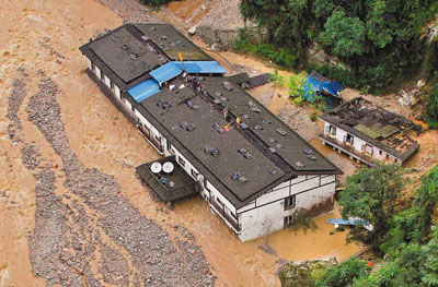 ■14日,都江堰市龍池和虹口兩個鎮洪水尤為猛烈,近千名民眾被困「孤島」。圖為民眾站在屋頂求援。 中新社