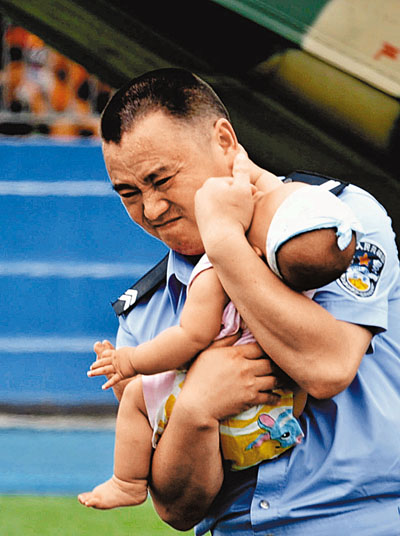 14日,一位警察懷抱著從清平鎮轉移出來的嬰兒,跑步離開直升飛機。新華社