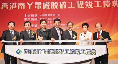 南丫發電廠脫硫工程昨日舉行竣工慶典,中聯辦副主任郭莉,中國國電集團黨組書記、副總經理喬保平、副總經理高嵩,環境局署理局長潘潔,港燈集團工程及發展董事尹志田,本報董事長及社長王樹成等逾百嘉賓出席。潘潔致辭時表示,有關工程是內地與香港共同合作的典範。