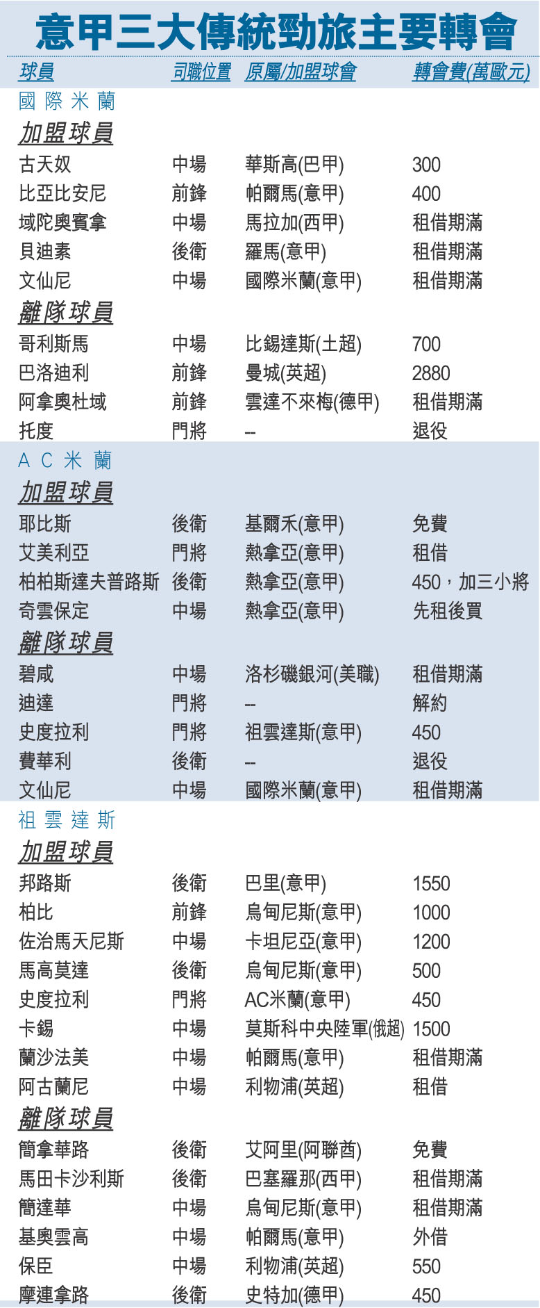 意甲三大傳統勁旅主要轉會 (2010-08-22) (圖)