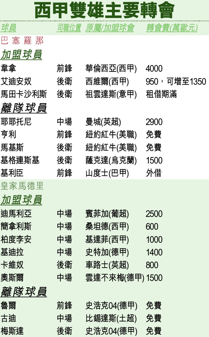 西甲雙雄主要轉會 (2010-08-22) (圖)