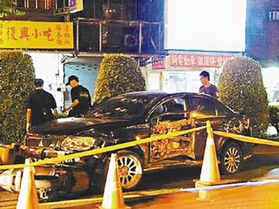 ■台北縣警方20日晚與歹徒槍戰,開車歹徒衝撞員警的機車,車身彈痕累累。 網上圖片