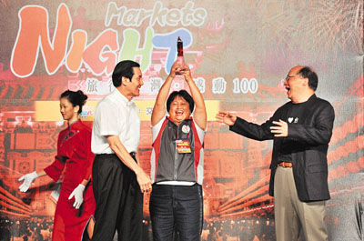 ■2010特色夜市選拔24日揭曉,馬英九在台北頒獎給獲選最美味夜市的台中逢甲夜市代表。圖右為台中市長胡志強。中央社
