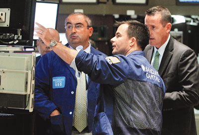 ■道指開市一度跌穿1萬點關口,紐約交易員在觀看數據。 美聯社