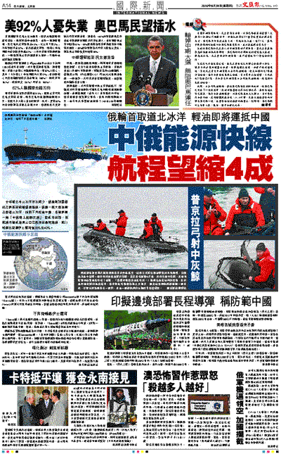 全球暖化令北冰洋浮冰減少,俄羅斯試圖藉此打開新的戰略貿易路線。俄國一艘大型油輪正取道北冰洋,預料下月抵達中國,希望開闢一條「中俄海上能源快線」,若成功的話,新航線可望成為東北亞往歐洲的最短路線,航行時間比經蘇伊士運河省30%至40%。