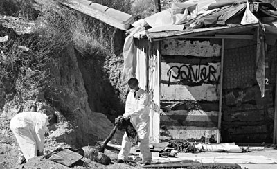 ■墨西哥暴力事件頻生。圖為墨國警方鑑證人員於本周一檢驗一名受害者屍體。美聯社