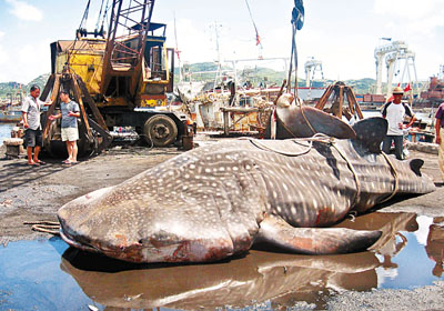 8月26日清晨,在浙江省台州市大陳島附近海域,一條長約6米、重約3噸的金錢鯊誤入漁網窒息而亡。據了解,金錢鯊學名鯨鯊,最大個體可長達20米,重10餘噸,有「魚中之王」之稱。主要分布在太平洋海域,性情較溫和,在中國沿海地區均有分布,因形似蛤蟆,又被沿海漁民們稱為「蛤蟆鯊」。中新社