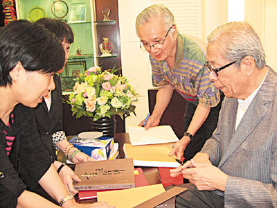 ■施子清博士贈書予校友會成員,並簽名留念。廈大旅港校友會提供照片