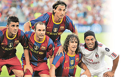 ■細哨(右)賽前扮作巴塞一員合照,伊巴(上)仍有上陣。 法新社