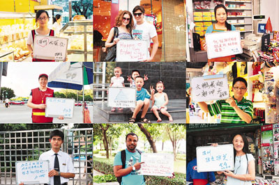 深圳大學生湯文芳帶上可擦寫的小白板和相機,走上街頭為深圳收集100個生日祝福。圖為湯文芳拍攝的部分參與者和他們寫下的祝福。 新華社