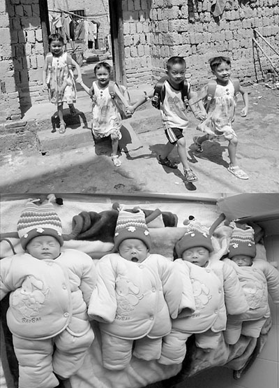 江西省贛州市南塘鎮四胞胎周嘉春、周嘉蘭、周嘉秋(男)、周嘉菊03年出生,他們即將進入鎮上的小學讀書。上圖為如今的四胞胎。下圖為他們出生不久的合影。新華社