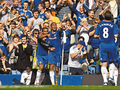 車路士在林柏特射失12碼後,憑馬隆達(左)上半場建功及杜奧巴(右)換邊後入12碼,主場勝史篤城2:0,英超3連勝。 法新社