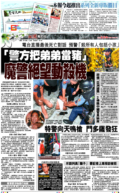 菲律賓魔警門多薩上周一從起初的和平談判,到其後突然大開殺戒,他動怒殺人的過程,全記錄在菲律賓RMN電台的直播訪問中。菲警拘捕門多薩弟弟成為導火線,門多薩警告若不放人,便殺死所有人質,連孩子也不放過。