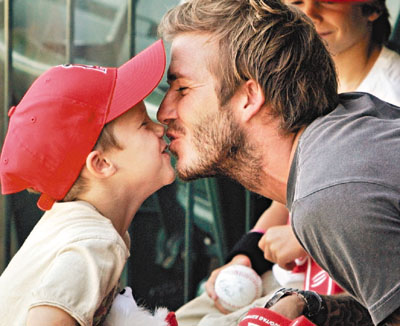 ■周日,「萬人迷」碧咸帶同兒子告魯爾觀看美職棒期間,父子情深互吻。美聯社