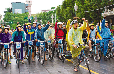 台灣「行政院」體委會昨日於台北孔廟舉辦單車成年禮始業式,近百名青年冒雨參加,他們將騎單車環台1,000公里。 中央社