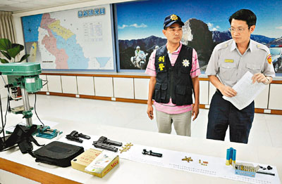 台灣新竹縣警方昨日宣布破獲 一宗非法製造販賣槍械案,並展示改造槍械工具、槍械與彈藥等證物。 中央社