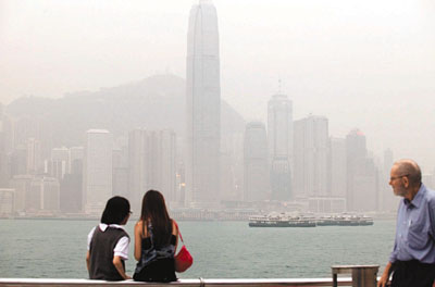 ■本港受颱風「獅子山」外圍氣流影響,昨日天氣悶熱,空氣質素持續欠佳。圖為煙霞籠罩下的維港。 本報記者曾慶威 攝