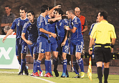 ■昨晨F組首輪歐洲國家盃外圍賽,以色列憑班拿約(左五)連中三元,主場勝馬耳他3:1。 路透社