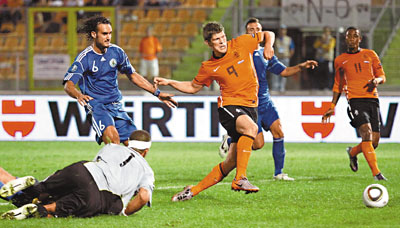 今夏世盃亞軍荷蘭在E組作客大炒魚腩分子聖馬力諾5:0。失意離開意甲AC米蘭轉戰德甲史浩克04的前鋒亨特拉爾(左圖中)個人入3球,英超利物浦鐵人古積特以及2008年退出荷足後憑勇態是役獲補召入伍的前鋒老將雲尼斯杜萊也有進帳。 ■梁志達