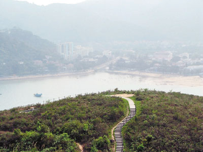 走過銀礦灣,沿指示牌的愉景灣方向上山,初段需要走上千多梯級,從上轉身回望梅窩的迷人景色:一望無際的海洋,藍天白雲,風光如畫。經過多級後,沿途樹蔭,站在山的高處——觀景亭內,遠眺大嶼山附近的島嶼,環境幽美。