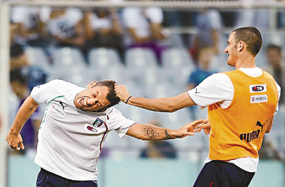 ■卡斯辛奴(左)與隊友玩得不亦樂乎。 法新社