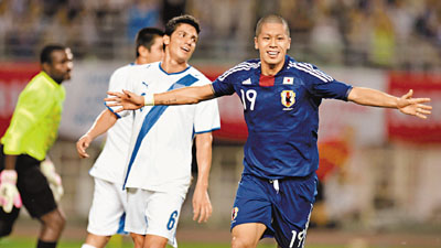 森本貴幸(右)上半場兩度轟破客軍危地馬拉的大門,日本隊在昨晚友賽最終保持上半場2:1的勝果完場。 法新社