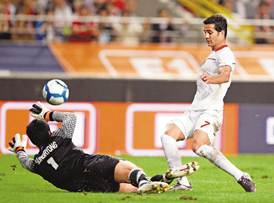 韓國隊昨晚友賽主場以0:1不敵伊朗,圖為伊朗的蘇查伊(右)射破鄭成龍的大門。 路透社