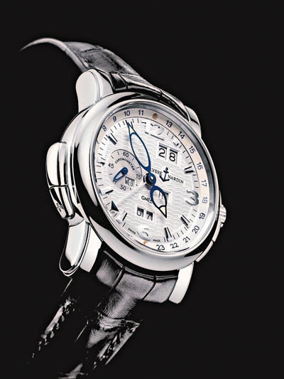 腕錶更配置有功能超強的專利時針快調按鈕,在無需脫下腕錶的狀態下,輕壓八點鐘方向的(+)鍵,時針直接前進一小時,輕壓四點鐘方向的(-)鍵,時針直接後退一小時,分針仍然持續運行,絲毫不影響準確度,讓使用者可以輕易掌握時間。當使用時針快調按鈕向後調校當地時間時,大日期顯示窗會隨著跨越國際換日線而自動調整顯示日期。若你在新年時乘坐飛機往西邊的途中調校腕錶,年、月、日、星期等均可直接向後調校。無論走到世界任何角落,掌握全世界時間盡在彈指之間。而傳統腕錶只能顯示一個時區的時間,當旅遊或洽商至國外時,往往因為未能夠掌握原居地時間而帶來不便。「GMT±萬年曆」腕錶在無須脫下或影響腕錶的時間運行下,便可將腕錶準確調校至當地時間,同時掌握當地及原居地時間,適合經常出國人士使用。若腕錶沒有原居地時間顯示,佩戴者需自行計算原居地時間,費時失事。