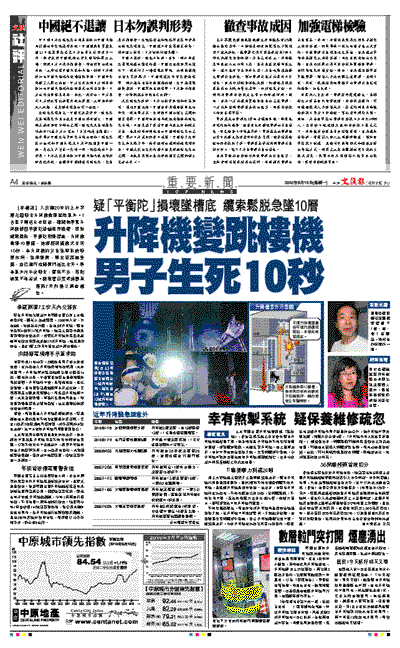 上水消防局高級消防隊長陳如海表示,初步調查不排除是升降機吊著平衡陀的鋼索出問題,以致平衡陀掉下造成意外,所幸升降機的安全系統發揮作用,在14樓及時煞停,未致釀成奪命慘劇,至於意外確實原因,需機電署作進一步調查。