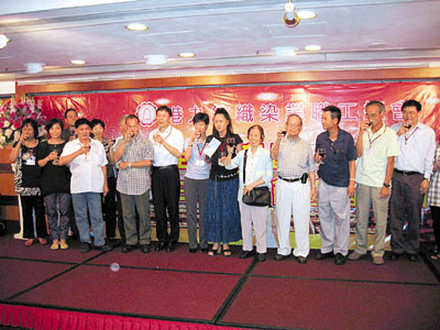 ■紡織染工會慶祝國慶暨會慶聯歡,理事在台上祝酒。