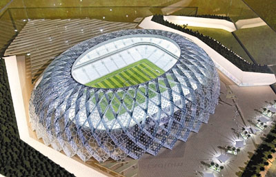 國際足聯考察代表團昨抵達申辦2022年世界盃的卡塔爾,圖為賽事其中一個新主場館的模型。 路透社