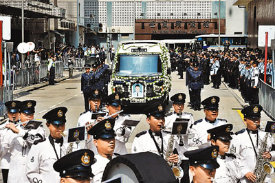【本報訊】上月在粉嶺因公殉職交通警員梁鼎崙,昨晨以警隊最高榮譽喪禮儀式舉殯。警務處處長鄧竟成、保安局副局長黎棟國、逾百名警務人員及其他紀律部隊代表到靈堂致祭。靈柩其後運到粉嶺和合石浩園安葬。
