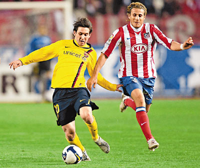 ■巴塞王牌美斯(左)與馬體會的射手科蘭較量。