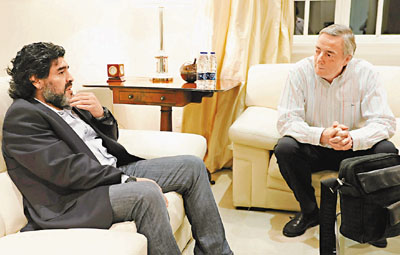 阿根廷「球王」馬拉當拿(左)跟阿總統克里斯蒂娜的丈夫基什內爾會面,官方稱這是朋友式會面,亦有傳老馬擬借「第一家庭」之力重返阿足帥位。路透社