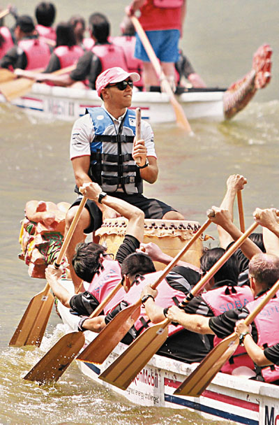 ■F1新加坡站周日展開,麥拿侖車手咸美頓(藍背心)昨日在一場龍舟賽客串擔任領航鼓手,似模似樣。 美聯社