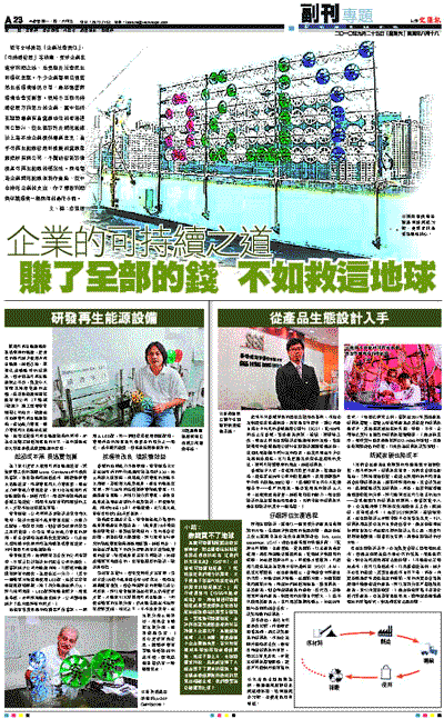 近年全球掀起「企業社會責任」、「可持續發展」等熱潮,要求企業在追求利潤之餘,也要顧及社會民生和環保意識。不少企業都明白到若然生活環境情況日差,最終連營商環境也會受影響。現時不乏朝可持續發展方向努力的企業,當中包括在認證專業有著龍頭地位的香港通用公證行,從生態設計及減低碳排放上為本地企業提供專業意見;著手可再生能源發展和推廣的龍源集團控股有限公司,不斷研發新設備提高可再生能源的穩定性。兩者都為企業減低能源消耗作貢獻,從中也降低企業的支出,作了賺取利潤與保護環境一舉兩得的最佳示範。 ■文、攝:盧寶迪